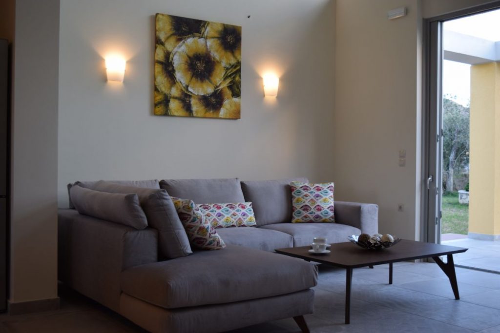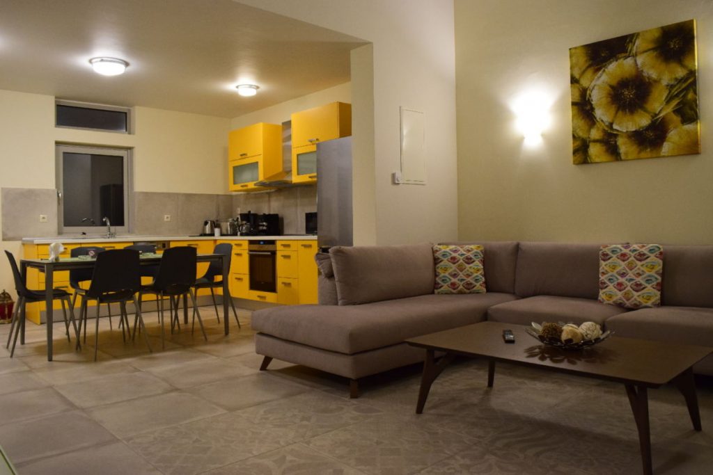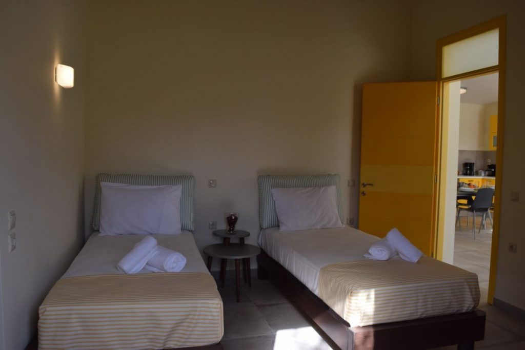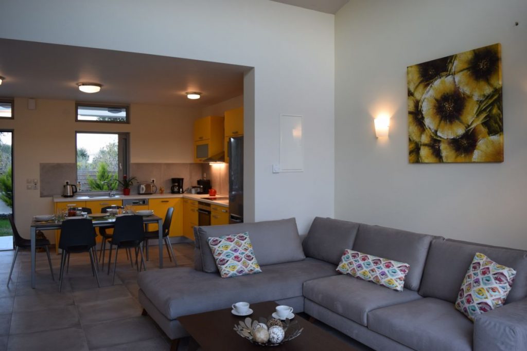 The property (100 m2) is able to accommodate 5 people. It offers 2 big bedrooms with king size beds and memory foam mattresses for an incredibly comfortable sleep. Every bedroom has an en-suite bathroom. The villa offers a fully equipped kitchen, a dining room, as well as a spacious and modern decorated living room with a sofa that easily turns into a comfortable single bed.
